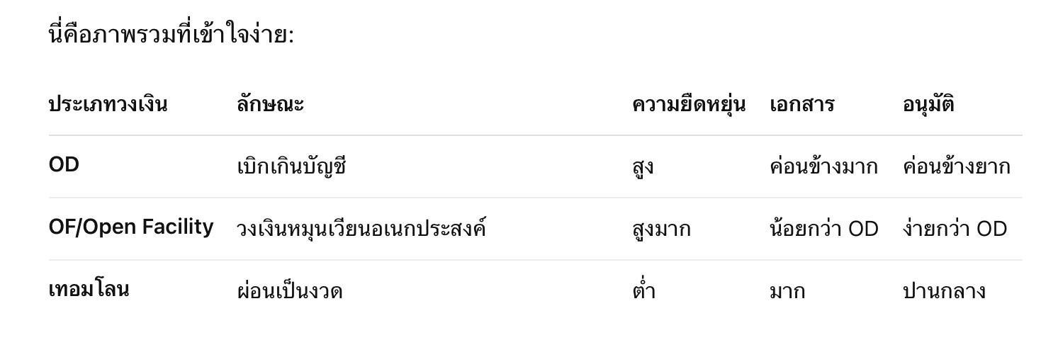 หาก OD ไม่ตอบโจทย์ — ยังมีตัวเลือกอื่นที่ยืดหยุ่นกว่า เช่น OF หรือวงเงินหมุนเวียนจากผู้ให้บริการเอกชนที่เหมาะกับ SME มากกว่า