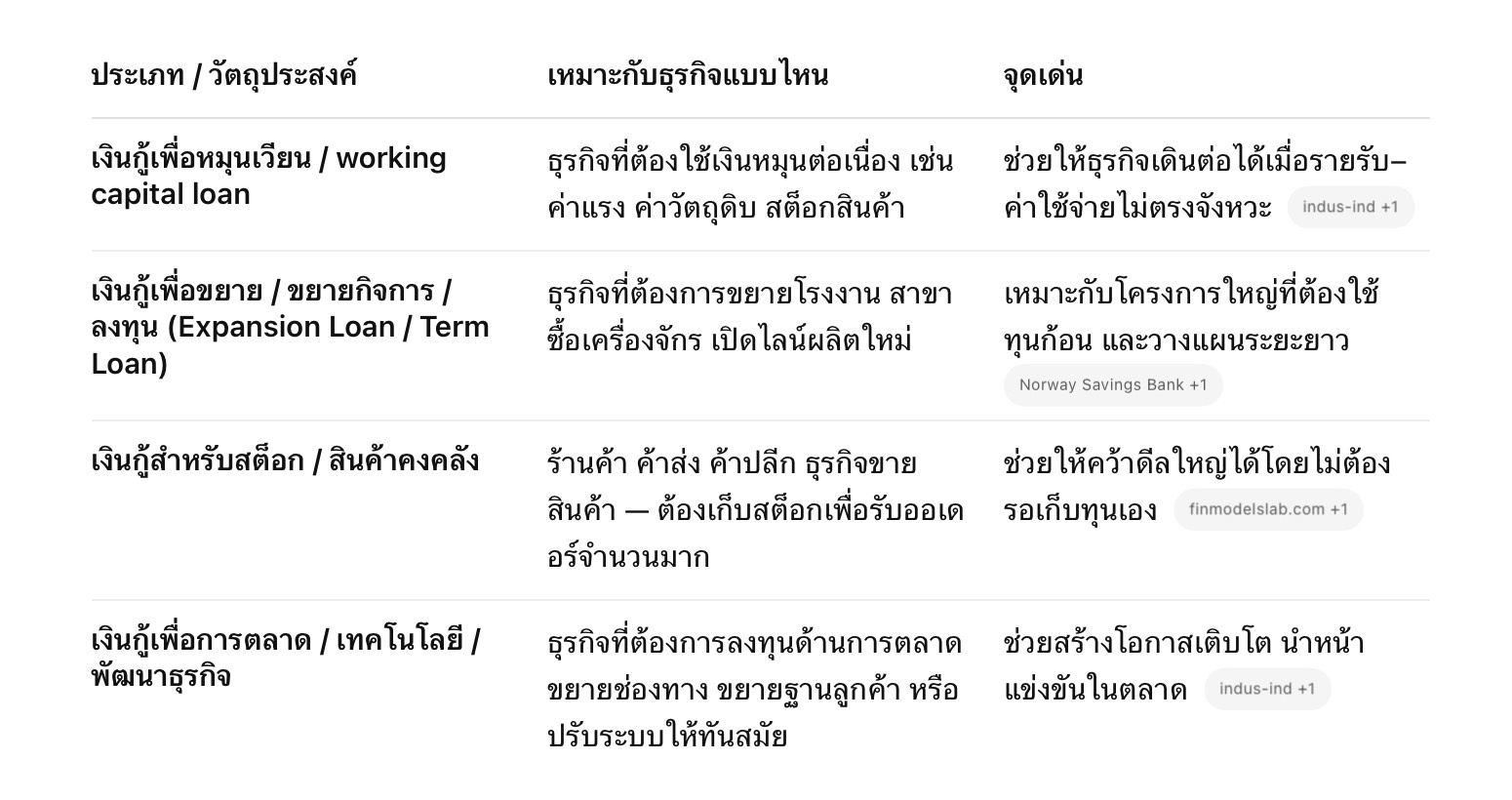 • ยืดหยุ่นในการใช้เงิน — คุณสามารถนำไปใช้ในหลายวัตถุประสงค์ เช่น สต็อกสินค้า ขยายโรงงาน เปิดสาขาใหม่ หรือเพิ่มระบบหลังบ้าน