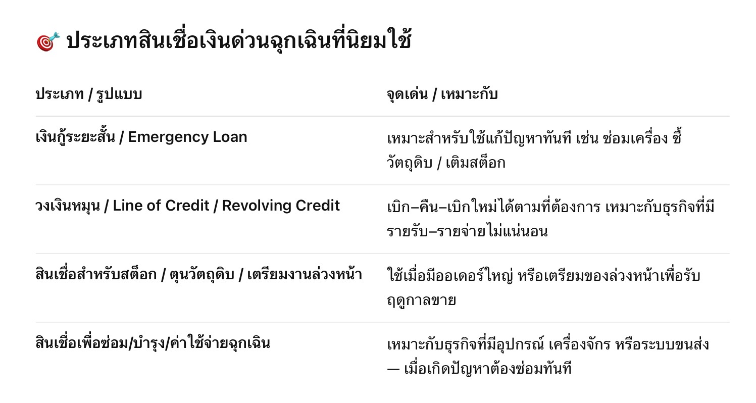 “สินเชื่อเงินด่วนฉุกเฉิน” คือหนึ่งในเครื่องมือทางการเงินที่สำคัญสำหรับผู้ประกอบการทุกขนาด โดยเฉพาะ SME ที่อาจไม่มีสภาพคล่องสำรอง