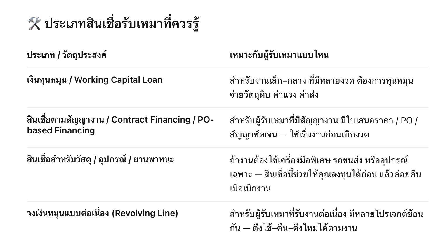 • โดยทั่วไป สินเชื่อรับเหมามักเป็น “สินเชื่อหมุนเวียน” หรือ “เงินทุนหมุน / สภาพคล่อง” มากกว่า “เงินกู้ยาวระยะลงทุน” — เพราะงานก่อสร้างหรืองานสัญญามักมีรอบการชำระเป็นงวด/งวด และต้องจ่ายต้นทุนล่วงหน้าก่อนได้รับเงิน